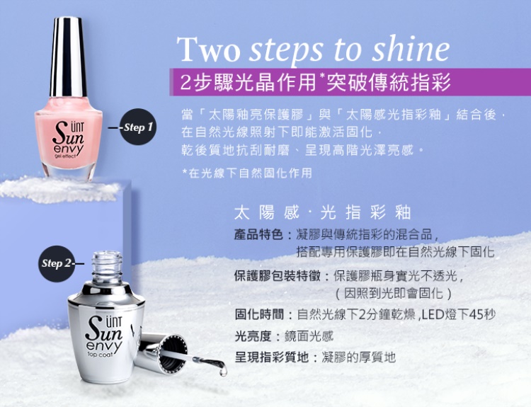 | | 《UB0109》一場奇妙的光晶作用*,在1 + 1 起開始悸動 當日光照映妳指尖,指彩的重新改寫, 並且,凝凍成堅硬的存在。 *在光線下自然固化作用 全新指彩品種 「太陽感光指彩釉」 「2步驟」光晶作用 突破傳統指彩 當「太陽感光指彩釉」遇見「太陽釉亮保護膠」,免去LED燈的繁複動作, 透過自然光硬化激活指甲彩,只要2步驟即能帶來高階光亮色澤, 更擁有持久耐刮度,使用一般去光水可以輕鬆卸除。 「太陽釉亮保護膠」自然光取代LED燈光的關鍵 「太陽釉亮保護膠」採用歐洲專業配方,與太陽感光指彩釉結合後, 能讓平凡的自然光下,極致放大美麗指彩效果,激活硬化指彩。 乾後甲色加倍奪目耀眼,耐刮耐磨,維持釉亮色澤。 使用方法 Step 1:太陽感光指彩釉 高顯色、高亮澤專業配方,革命性高階鎖色科技,不沉澱、不易傷指甲;緊密與指甲表面貼合,比微戀愛更持久。 Step 2:太陽釉亮保護膠 與太陽感光指彩釉搭配使用,能神奇轉換為寶石般晶亮色澤。 乾燥後光芒封存、抗刮耐磨、色彩飽鮮,一般去光水可卸。 注意事項 使用產品前,請先輕晃瓶身。 均勻薄擦太陽感光指彩釉,建議刷兩層。 等待約8分乾時,擦上太陽釉亮保護膠,以達最佳顯色效果。 保護膠完全乾後,超持久的指彩即完成。 請搭配全系列UNT太陽感光指彩釉商品使用。 本產品僅供外用,請避免兒童誤食,並遠離高溫及火源。 使用完緊鎖上蓋,請置於陰涼通風處,避免陽光直射。 「太陽感光指彩釉」與「太陽釉亮保護膠」的刷頭因經過電鍍處理,使用數次後可能會變深色,此為正常氧化狀況,對皮膚身體無害,請放心繼續使用。 北衛粧廣字第10410131號 北衛粧廣字第10410132號 |